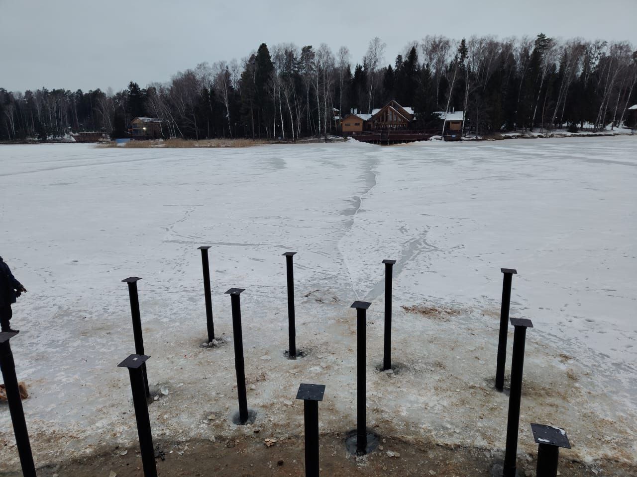 Выбор времени года для проведения работ был неслучайным. Зима является наиболее благоприятным периодом для возведения подобных сооружений на воде. Благодаря крепкому ледяному покрову наши специалисты получили устойчивую площадку для работы, что позволило избежать использования дорогостоящих понтонов или специализированной плавучей техники. Работа со льда дает возможность максимально точно позиционировать каждую опору и контролировать вертикаль при закручивании, обеспечивая идеальную геометрию будущего строения.