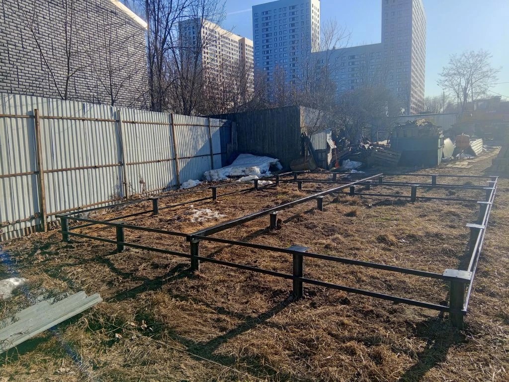 Смонтировали 24 винтовые сваи с обвязкой профтрубой 20х40 для строительства дома 6х8м из оцилиндрованного бревна
